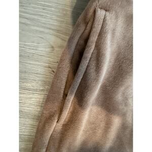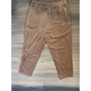 Stay cozy in these Cuddl Duds velour pajama pants in a soft dusty rose hue. Made of 95% polyester and 5% spandex, these pants feature a plush, velvety texture with an elastic waistband and drawstring tie for adjustable comfort. Side pockets add functionality, while the relaxed, tapered leg creates a flattering loungewear silhouette. Tag size PXL (Plus Extra Large). Approximate measurements: 17.5” waist (unstretched), 39.5” length, 24” inseam.