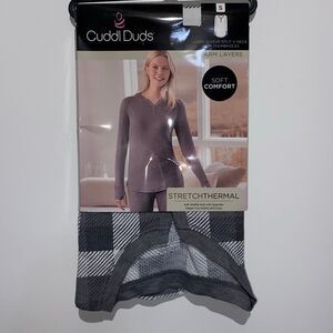 Cuddl Duds Women's Gray Check Stretch Thermal Long Sleeve Split V-Neck Top Size Small NWT