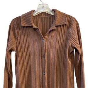 Keywords: Cuddl Duds, button-up, small petite, brown, polyester, spandex, long sleeve, casual, fall, women's clothing, machine washable, China, solid pattern, regular fit, pre-owned.