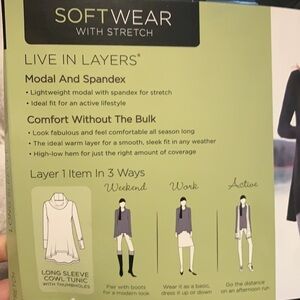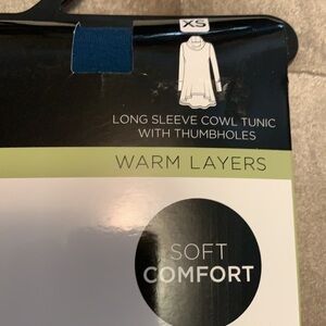 If you don’t own CuddlDuds yet, you need to! This is a peacock blue long sleeve cowl neck tunic with thumbholes and is so comfortable you’ll want to wear it all of the time. Size XS, see size chart on back. A smaller small would also be fine in this. Thumbholes!!!