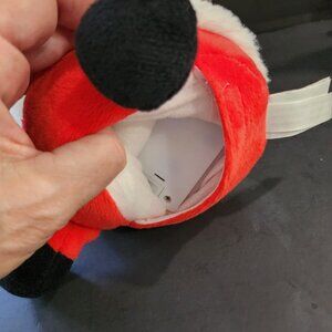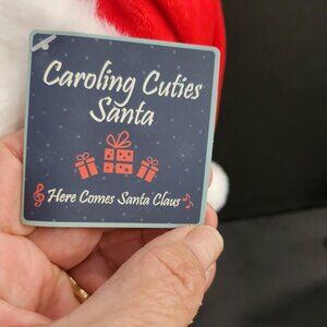 A new Christmas plush with tags for ages two and up. This is a cuddle barn caroling cutie's Santa Claus Plush. He sings Here comes Santa Claus When you squeeze his hand. Very soft. Measure 10.5 inches tall. Takes three. AAA battery. Comes with batteries too. Ready to use. Non smoking pet free home. @ER TOP SHELF