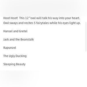 Tags on- Never played with! Stored in a smoke free home. Recites 5 fairy tails. Eyes light up and mouth moves as the owl shifts side to side.
