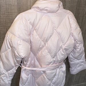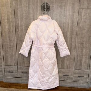 Cozy pink quilted robe with a tie belt. Perfect for lounging.