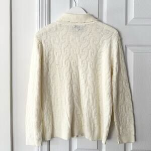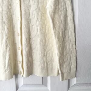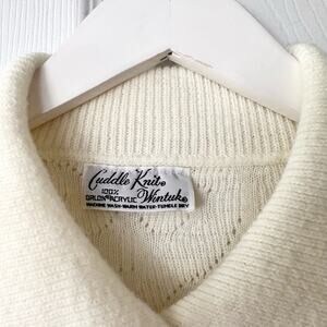 No size tag but will fit a size medium. From Cuddle Knit Wintuk. Made with 100% orlon acrylic. Vintage 50s 60s era. Pointed cream collared cardigan with pointelle cable knit swirl texture. Preowned in good condition with no stains or tears.