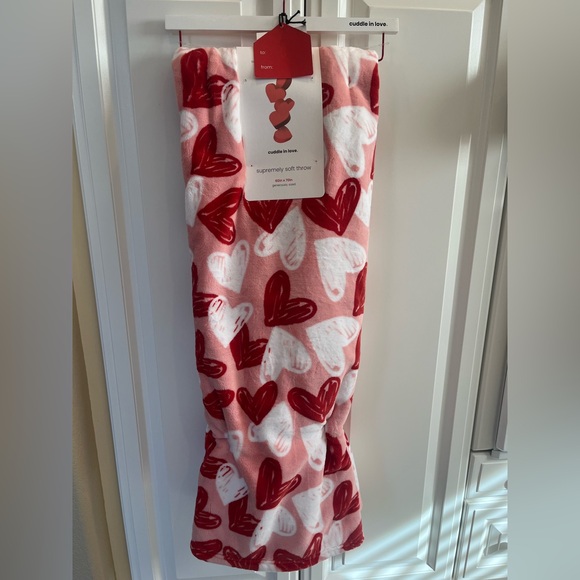 Cozy throw blanket with red and white heart patterns on a pink background. Perfect for adding warmth and style.
