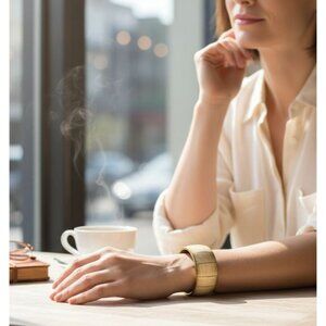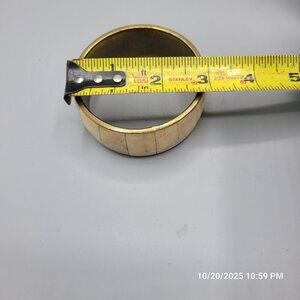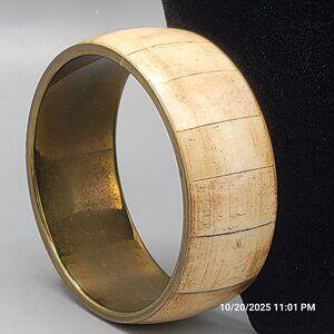 This vintage 70s cuff bangle bracelet features a brass construction with bone inlay, giving it a casual and boho look. The round shape and bangle closure make it easy to wear on the wrist. The ivory bone color contrast with the brass metal, adding a unique touch to the piece. This unisex bracelet is perfect for those who embrace a bohemian style and appreciate original vintage jewelry pieces.