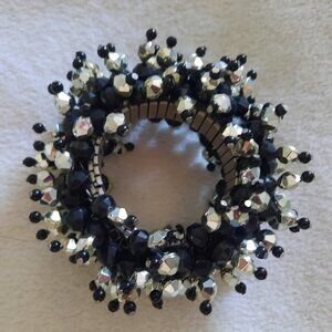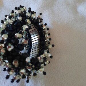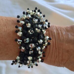 Unique shiny and sparkly black and silver tone beaded bracelet. This unique piece measures approx. 2 1/2 in. wide and expands to approx. 4 in. across inside when expanded. It is set on an accordian stretch base to go over your hand and have a secure and comfortable fit. This one of a kind bracelet is an eye catcher wherever you wear it.