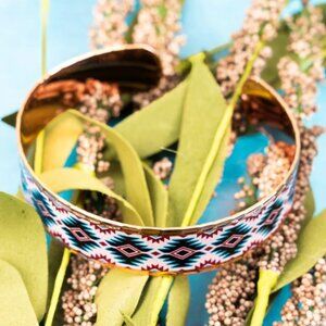 This is an awesome cuff bracelet! π Beautifully designed copper bracelet featuring a turquoise, black, burgundy, and white Southwestern Aztec Pattern. A lovely gift idea! 5/8" wide. One size fits most.