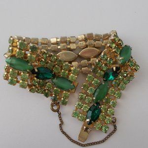 All stones are prong set. Measures 7 1/8" from tip to tip. 1" wide. There is 1 small stone missing from clasp. See photos.