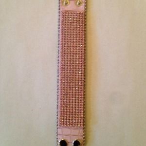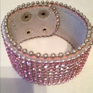 Pink leather cuff with pink rhinestones. Snap closure. One size.