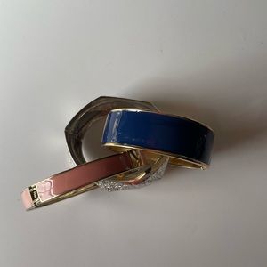 3 cuff bracelets - blue with gold edges - peach with gold edges - silver