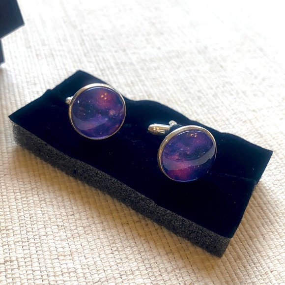 Silver metal cuff links with purple galaxy image. Never worn-brand new with gift box. Diameter of image is 3/4 inch across