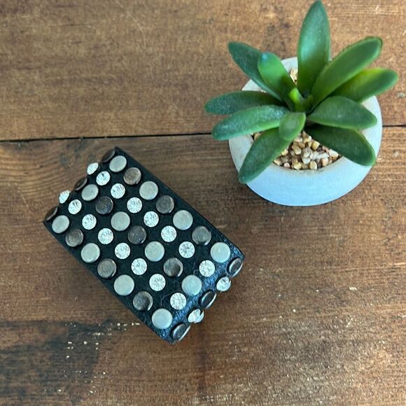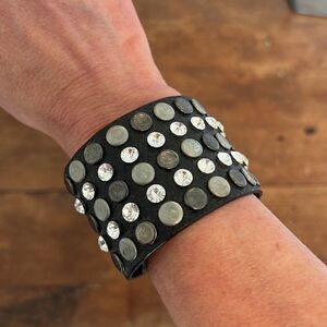 Black leather cuff bracelet with rhinestones and grommets Snap closure A little wear on some grommets but in overall good condition - see pictures