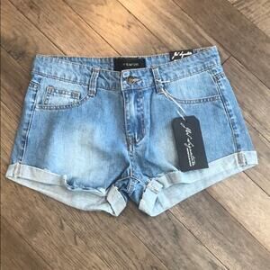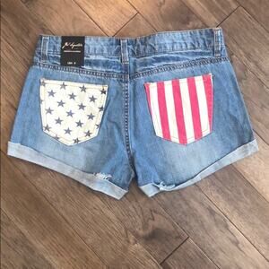 Cuffed denim shorts with American flag design on back pockets. Zip up front with button closure. 100% cotton.