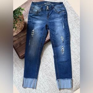Super stylish and right on trend! These cuffed jeans with slight distressing go from day to night. Great with a pair of sneaks and a graphic tee to wedges and a cute halter and clutch…super comfy. Stretch too!