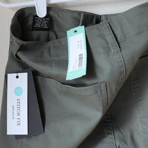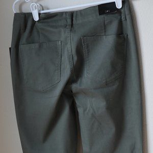 Olive trousers with front and back pockets, zipper and metal two-snap closure with beltloops. Size 27 waist, and length is just at the ankle, or ~28". A "boyfriend" style, very soft fabric. Came with a Daily Look designer box.