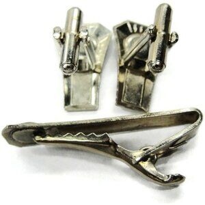 This vintage Unbranded Cufflinks and Tie Bar Set, featuring stamped steel with a bullet back style, showcases striking blue and green stones. Ideal for a tux shirt or suit in silver color.