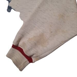 Features: pull-over style, ribbed crew neck, cuffs, and bottom hem, contrasting red trim along neckline and cuffs