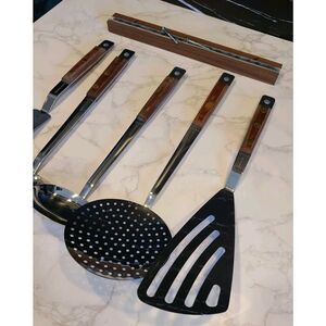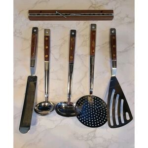 Cuisinart stainless steel kitchen utensils with Wooden handles, made in France, along with their wooden magnetic holder. The set