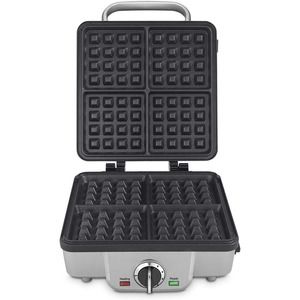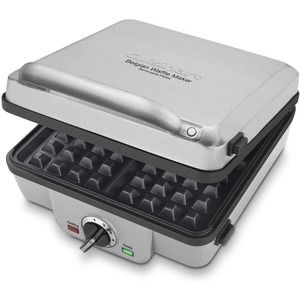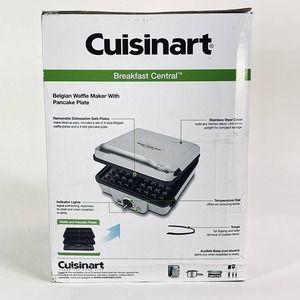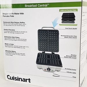 Make your own perfect pancakes and crisp and thick waffles thanks to the supremely convenient Cuisinart Belgian waffle maker with pancake plates. The brushed stainless steel cover makes the waffle maker look stunning in any kitchen and features adjustable temperature control with six browning settings, indicator lights, and an audible beep for foolproof operation. The plates are also removable and dishwasher safe to make cleanup simple.