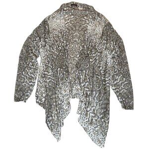 Beautiful light weight neutral leopard print semi sheer long sleeve open front asymmetrical flowy front cardigan. The perfect piece to add some pizzaz to any outfit.