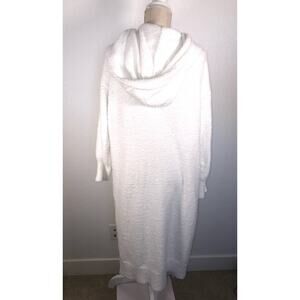 If you want to be cozy and comfortable this is the sweater for you. It is a beautiful white open-front hooded cardigan sweater. It is a soft and stretchy material that will keep you cozy and comfortable. New with tags, no rips or damage.