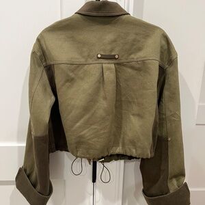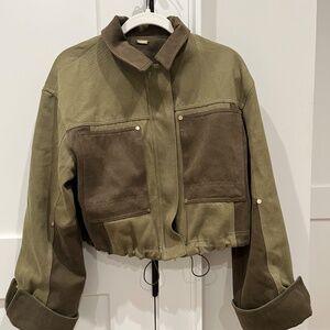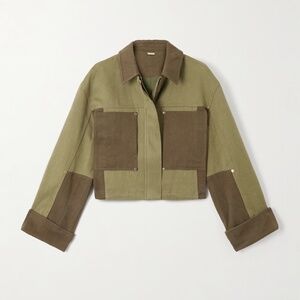 A cotton twill utility jacket with playful colorblock details and a cropped silhouette.