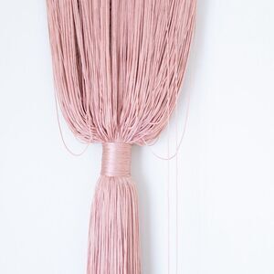 This handheld bag has ringed top resin handles that connect to a knitted fringe weave that drapes down and collects at a banded tassel giving luxurious movement and elegance. Angelou is a true object of art.