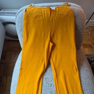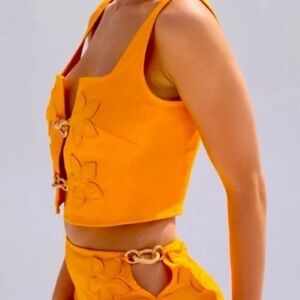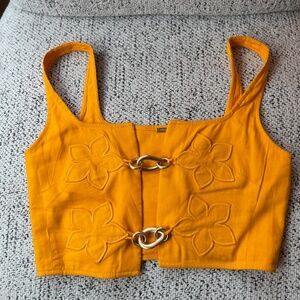 Top and bottom are both XS, sold together or separately. Gold-tone chain link clasp closures at center. Embroidered floral accents. Dry clean only.