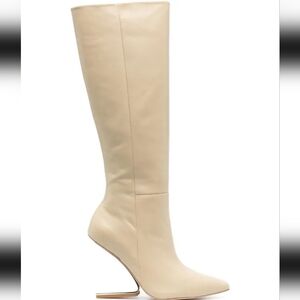 Ecru leather side zip fastening pointed toe signature suspension heel knee-length