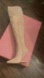 Stylish beige over-the-knee boots with a unique heel design. Size 39.5