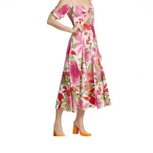 Cult Gaia's Dina dress is crafted of a luxe linen blend and features a fit-and-flare silhouette. This off-the-shoulder style is finished with a bright floral print and goldtone hardware at the bust.