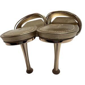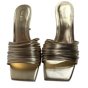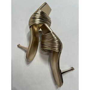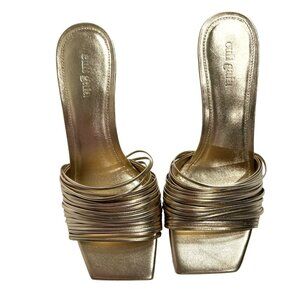 Description from retailer: Slip-on styling. Leather footbed and lining. Strappy design. Slanted square toe with gold-tone stiletto heel. Approx 90mm/ 3.5 inch heel. Revolve Style No. CULG-WZ135. Manufacturer Style No. SD1173NP.