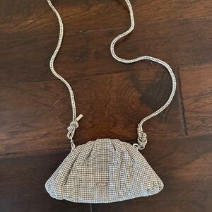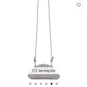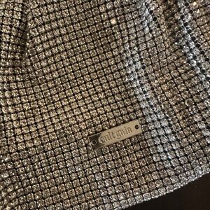 Rhinestone embellished exterior with metallic leather trim and microfiber lining
