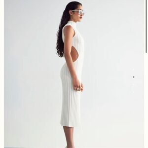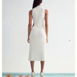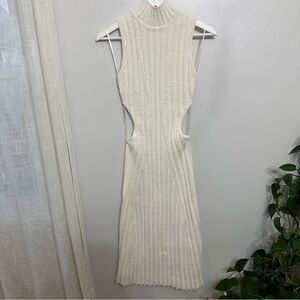 This chic Off-White ribbed knit dress is ultra-slimming and undeniably elegant. The high mock neck balances the thoughtful circular cutouts at the sides. The knit fabric is slightly stretchy with intentional ribbing to highlight the small of the waist and the hemline hits below the knee.