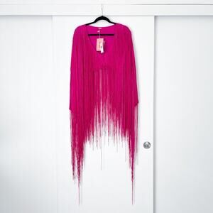 The Lorena Top by Cult Gaia flows with balanced hemlines and exaggerated movement. This top features tone-on-tone Anemone fringe cording that drapes down to the knee-level. The long-sleeve satin top is cropped and centers on deep, V-cuts from the stomach and neckline that converge at the bust. The cords offer playful color and movement. New with tags.