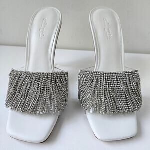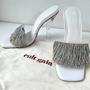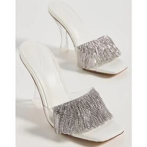 Cult Gaia Lana is a shimmering, optic white masterpiece that will dazzle at your next event. Playful layered rhinestone fringe strands are fixed on a clear, wide vinyl slide-on strap over the foot. A nappa leather sole offers padding atop a 4" acrylic heel.