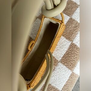 Cult Gaia Rhea Shoulder Bag in Neutral. Cult Gaia Rhea Shoulder Bag in Neutral. Rattan exterior with canvas lining and gold-tone hardware. Made in Vietnam. Lace-through leather top closure. One main compartment. Knotted leather top handle. Measures approx 11 W x 4 H x 3 D Top handle with a 6.5 drop.