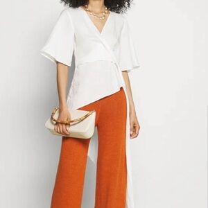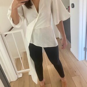 A structured wrap-style top with flared short sleeves and an asymmetric front, offering a sculptural silhouette that remains effortless and cool.