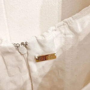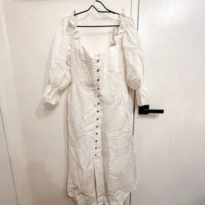 Cult Gaia Simona white dress. Linen blend. Off shoulder. Beautiful detailing around the busy and buttons. Has pockets. Gently used condition- pin hole on one sleeve, and interior staining shown in photos. Size large
