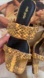 These Cult Gaia heels feature a sophisticated woven leather design in a chic tan color. With a medium-height heel and a modern square toe, they offer a stylish nod to 90s fashion. The slip-on style and intricate basketweave pattern make them a standout choice for any occasion.