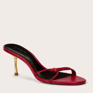 Keyword: Cult Gaia, CultGaia, Veda Sandal, red leather heels, ruby sandals, gold heel mules, open back sandals, strappy leather heels, minimalist sandals, modern evening shoes, architectural heel, wedding guest shoes, cocktail party heels, resort wear, summer heels, date night outfit, vacation style, chic footwear, quiet luxury, statement sandals, holiday party look