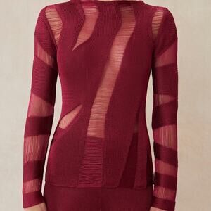 Designed in a slinky viscose knit featuring a distinctive drop needle motif in Carmine color. Cut-outs with fringe detail.