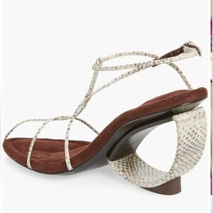 Slender straps twist above a soft footbed on this chic leather sandal boasting a fierce snakeskin pattern and an architectural heel.