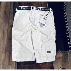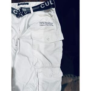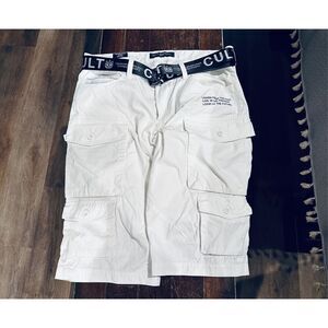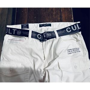 Size 34 | white | 80% Cotton, 20% Nylon | Hand Wash | Slim-style shorts with a relaxed waist and a low rise| 4 cargo pockets/ 4 regular pockets | Button Zipper closure | black Cult belt This short is crafted from premium denim and a vintage wash to create a unique denim color combination.