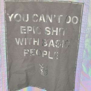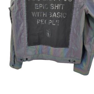Can't Do Epic Sh!t With Basic People spell out back. Elevate your wardrobe with this innovative 2-in-1 reversible jacket. Crafted with 3M reflective iridescent fabric and black premium denim, it blends style and functionality seamlessly.