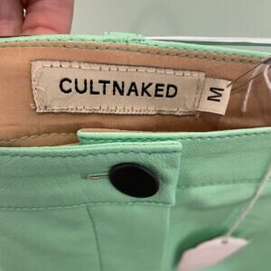 Pastel / mint green Killa Faux Leather Pants by Cultnaked. Brand new with tags. These straight leg pants have a long inseam that can be worn as is, or cut to your preferred length. High rise. Although these pants are new with tags, they do have a few discolorations on the back side of the pants - see last three pics. Rise measures approx. 11.5 inches. Inseam measures approx. 36 inches.