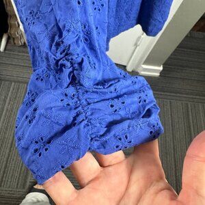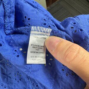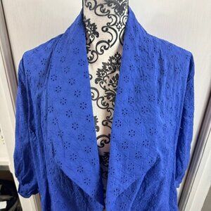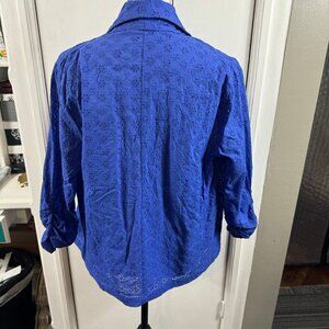 This Double Breasted Eyelet Jacket with Pockets is a chic and versatile piece for your wardrobe. The double-breasted silhouette and eyelet detailing add a touch of sophistication to your outerwear collection. Equipped with convenient pockets, this jacket is both stylish and functional. Whether you're dressing for work or a night out, this jacket is a fashionable choice. 100% cotton. Size small