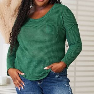 Stay cozy and stylish with this green waffle knit long sleeve top. Perfect for casual outings.