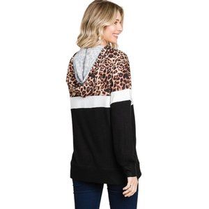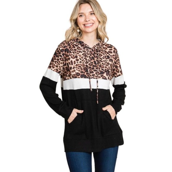 Culture Code's Color Block Hoodie Long Sleeve Top is a stylish pullover in black. This sweatshirt features a unique animal contrast design, long sleeves, and front side pockets.